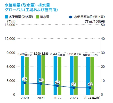 水資源は医薬品の生産に欠くことのできない重要な資源であり、持続的な利用を推進すべき生態系サービスの一つであると考えています。事業所が位置する国あるいは地域の水資源の状況、水使用にかかわるリスクや課題を把握するとともに、適正かつ効率的な利用、浄化装置による再利用の推進、使用量の削減などの対策を行っています。2024年度の水使用量は427㎥/億円 (2020年度比 50.4%減少) となりました。