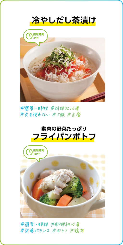• 「一汁三菜」などがんばりすぎず、まずは少しでも食べたいと思えるものを食べてみましょう。