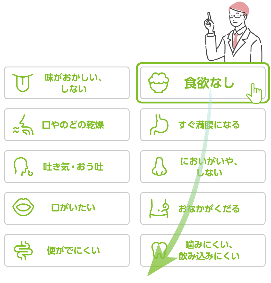 #食欲なし #食事の悩み #口やのどの乾燥 #口が痛い #噛みにくい #飲み込みにくい #化学療法 #吐き気 #嘔吐 #味覚異常 #臭いがしない #便秘 #下痢