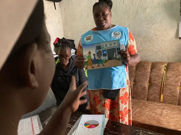 本事業で開発したダイアローグカードを使って子宮頸がんに関する啓発活動をする地域保健ボランティア