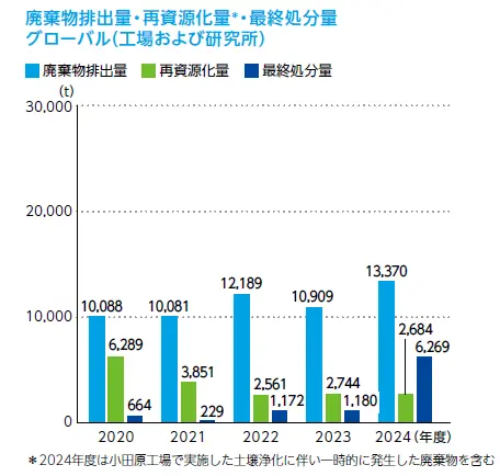 第5期中期経営方針に基づき、廃棄物の不適正処理の未然防止策の一環として、工場・研究所・オフィス等の事業所を対象とするEHS内部監査では、廃棄物処理法の遵守状況を重点的に確認しています。また、各事業所では、法律で求められている廃棄物処理業者の現地確認(法令の遵守状況、契約の履行状況、許認可状況、実際の処理状況など)を、定期的に実施しています。