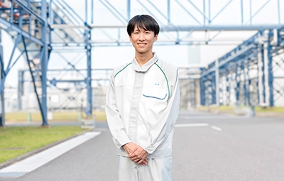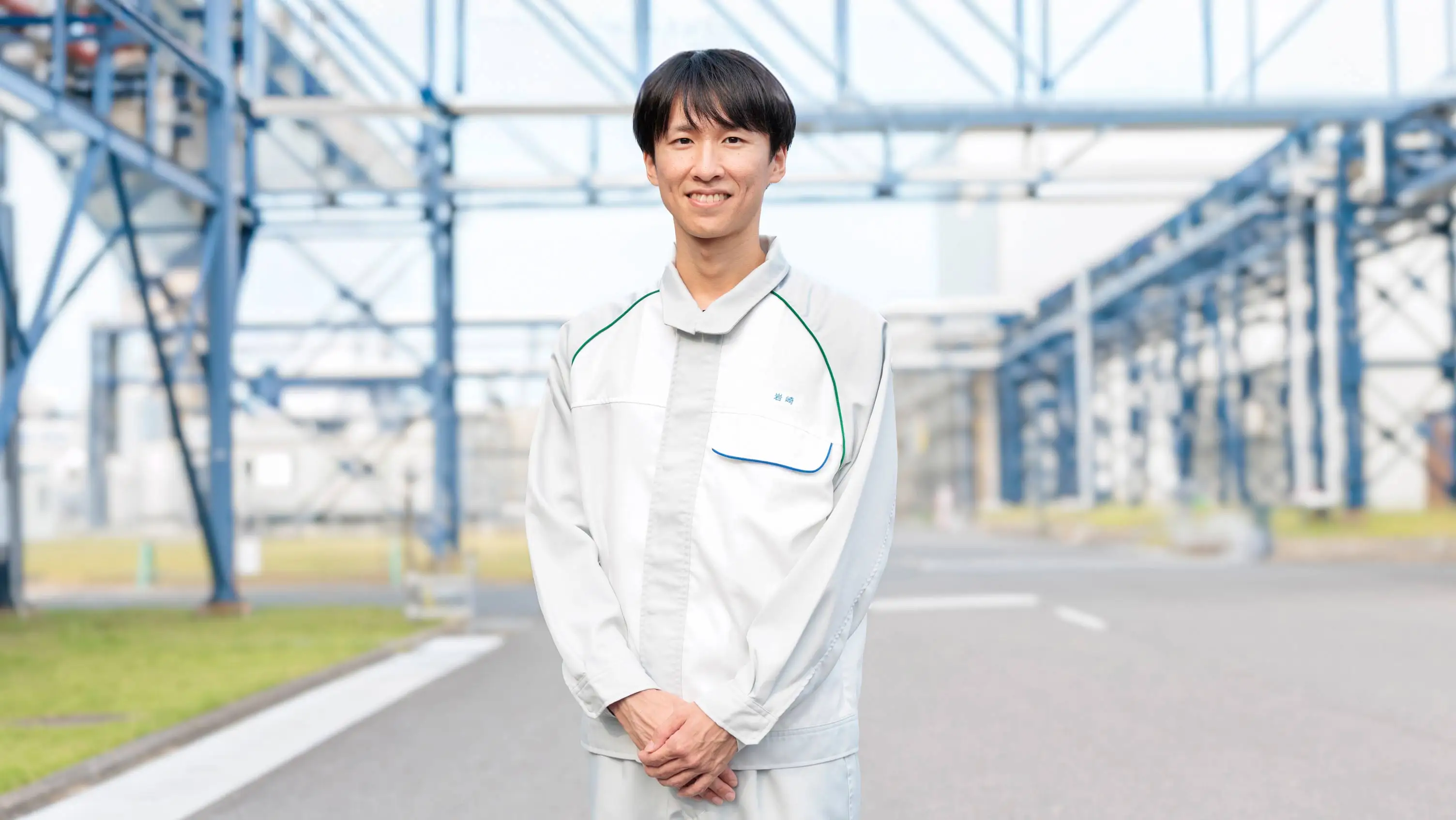新卒入社から6年目を迎えた現在、生産統括部の製薬課で、原薬製造に携わる岩崎文也さん。サブチームリーダーとして新たに導入された製造システムの立ち上げを担い、商用製造開始に向けて奮闘しています。その業務は、大容量の原薬を製造する設備機器を用いた際の製造パラメーターの最適化や、製造をスムーズに進めるための関係者との連携、チームメンバーへの技術・知識の継承などさまざまです。そこには、患者さんへ確かな品質の医薬品を届けるために挑戦を続ける岩崎さんの、強い使命感と熱い想いがありました。